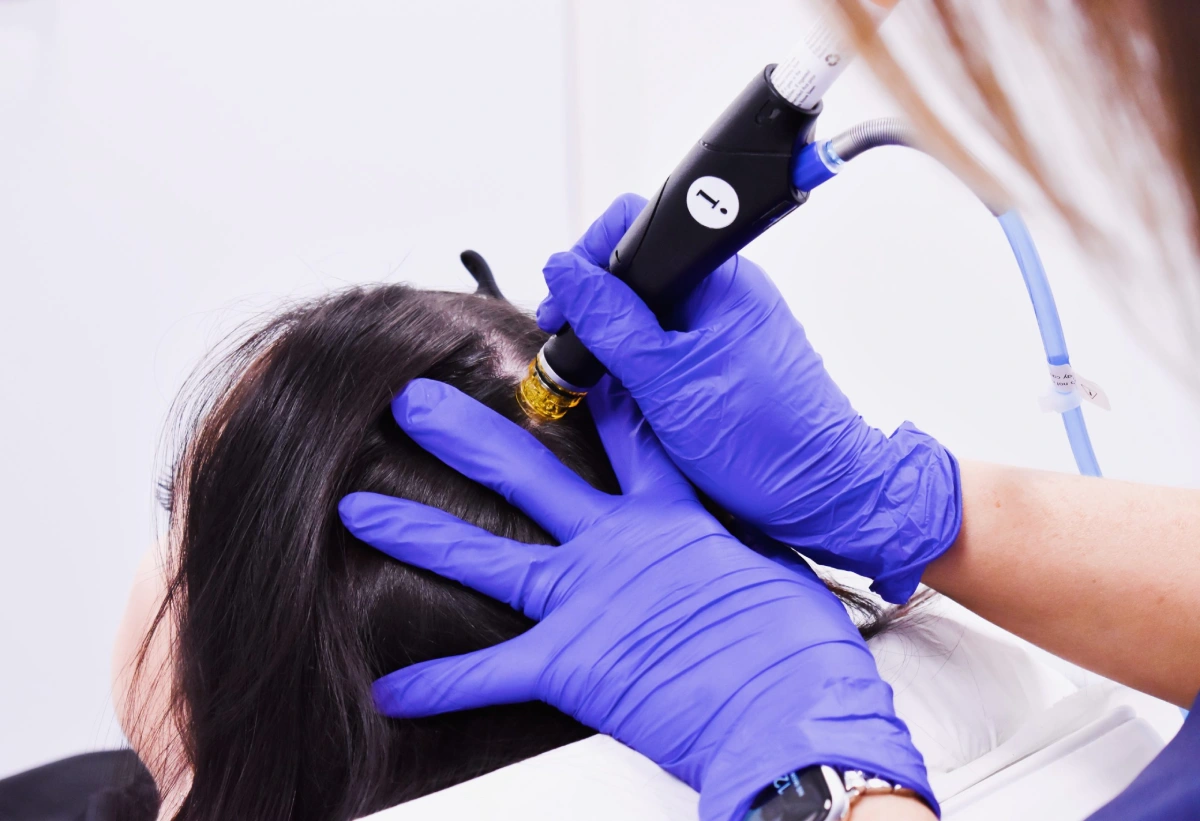 Scalp buildup is one of the main culprits behind an oily scalp. To tackle that, the first step involves a medical-grade exfoliating scalp cleanse to remove excess oils, dirt, and debris from the scalp.